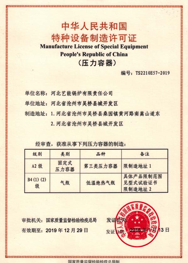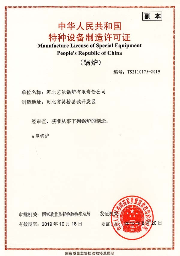 藝能鍋爐創(chuàng)立于1980年,經(jīng)過近40年的辛苦耕耘,現(xiàn)在公司擁有了先進的技術(shù)、設(shè)備和產(chǎn)品,已經(jīng)發(fā)展成為了中國北方一處重要的鍋爐生產(chǎn)基地。公司資質(zhì)證書如下(圖片較多,可能打開會比較慢):
